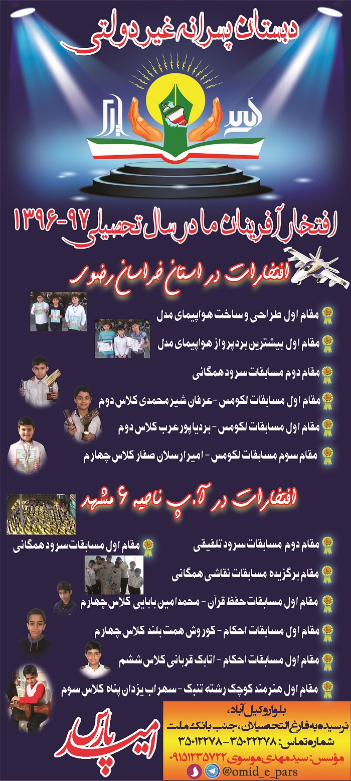 هوالحق با سلام و احترام دبستان امید پارس با رویکرد درس محوری و مهارت محوری با ویژگی استفاده از توانایی های بالقوه دانش آموزان و به فعلیت رساندن آن با ایجاد بستر مناسب فعالیت خود را از ابتدای سال 96 شروع نمود. دراین سال ها خصوصا تا قبل از شروع کرونا توفیقات زیادی از جمله کسب دوبار رتبه اول مسابقات استانی هوافضا در رشته های موشک آبی، نجات تخم مرغ و نیز پرتاب گلایدر دست پرتاب را در رقابت با مدارس متوسطه دوره اول از آن خود نمود. همچنین کسب سه سال رتبه اول و دوم مسابقات سرود گروهی و سه سال رتبه اول دوم و سوم سرود تلفیقی، دوسال رتبه دوم مسابقات نقاشی همگانی و سه سال رنبه اول دوم و سوم مسابقات تاترعروسکی، مقام اول و دوم 9 دانش آموز عزیزمان در مسابقات تک نوازی، مقام سوم مسابقات قرآن رشته حفظ، مقام اول دست نوشته های طلایی کلاس اولی ها، دوبار رتبه اول مسابقات جابربن حیان درسطح ناحیه و شرکت دانش آموزان در مسابقات ورزشی گروهی مانند فوتبال، تنیس روی میز و رشته شطرنج، رباتیک، دومیدانی، از افتخارات این مجموعه می باشد. اما بزرگترین افتخارما داشتن و تربیت دانش آموزانی مودب، کوشابا اعتماد به نفس و مهارت محور می باشد.